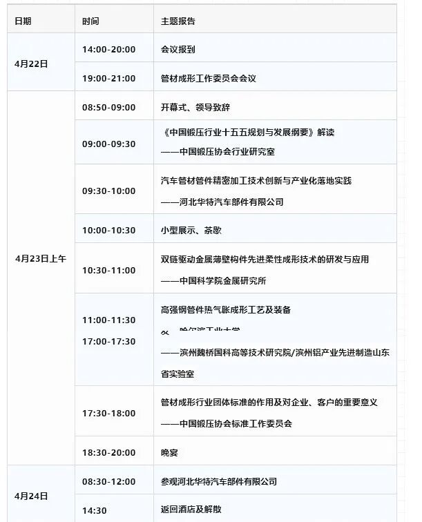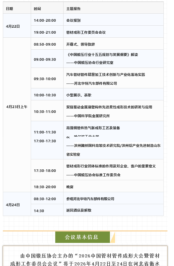 由中国锻压协会主办的“2026中国管材管件成形大会暨管材成形工作委员会会议”将于2026年4月22日至24日在河北省衡水市隆重举行。