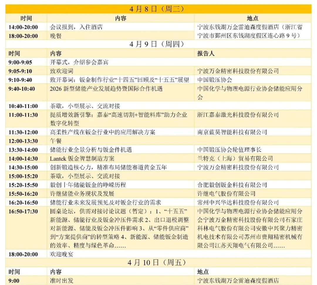 为解决这一问题,中国锻压协会拟定于2026年4月8-10日在浙江省宁波市召开“2026新能源、储能、电力行业钣金及冲压件需求升级研讨会暨对接交流会”。本次会议主题为“创新驱动,精准对接”,将邀请相关专家做专题报告,会议期间将进行交流、洽谈、企业参观等活动。欢迎相关单位踊跃报名参与!